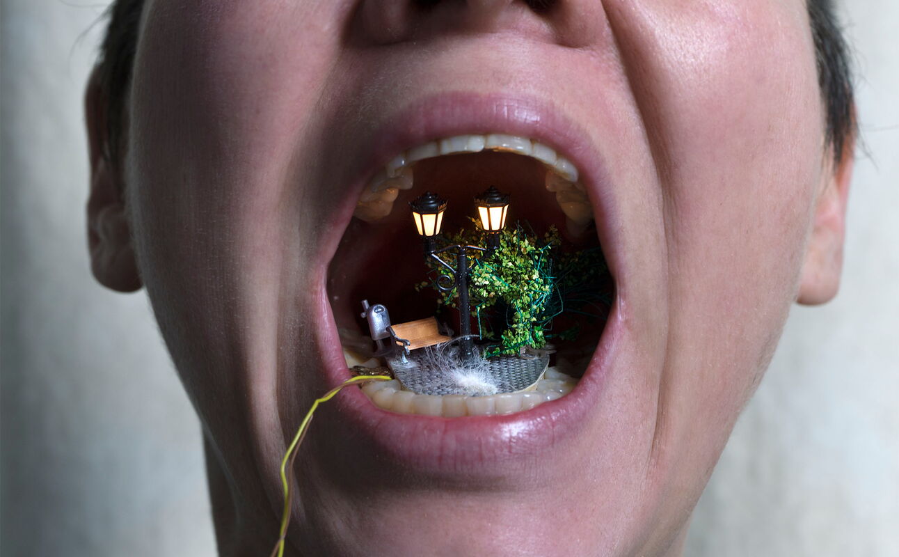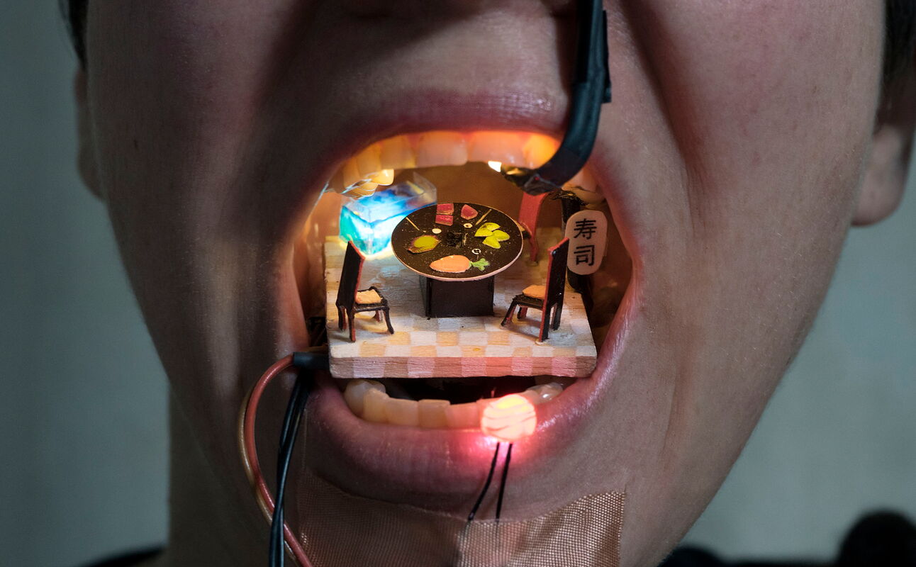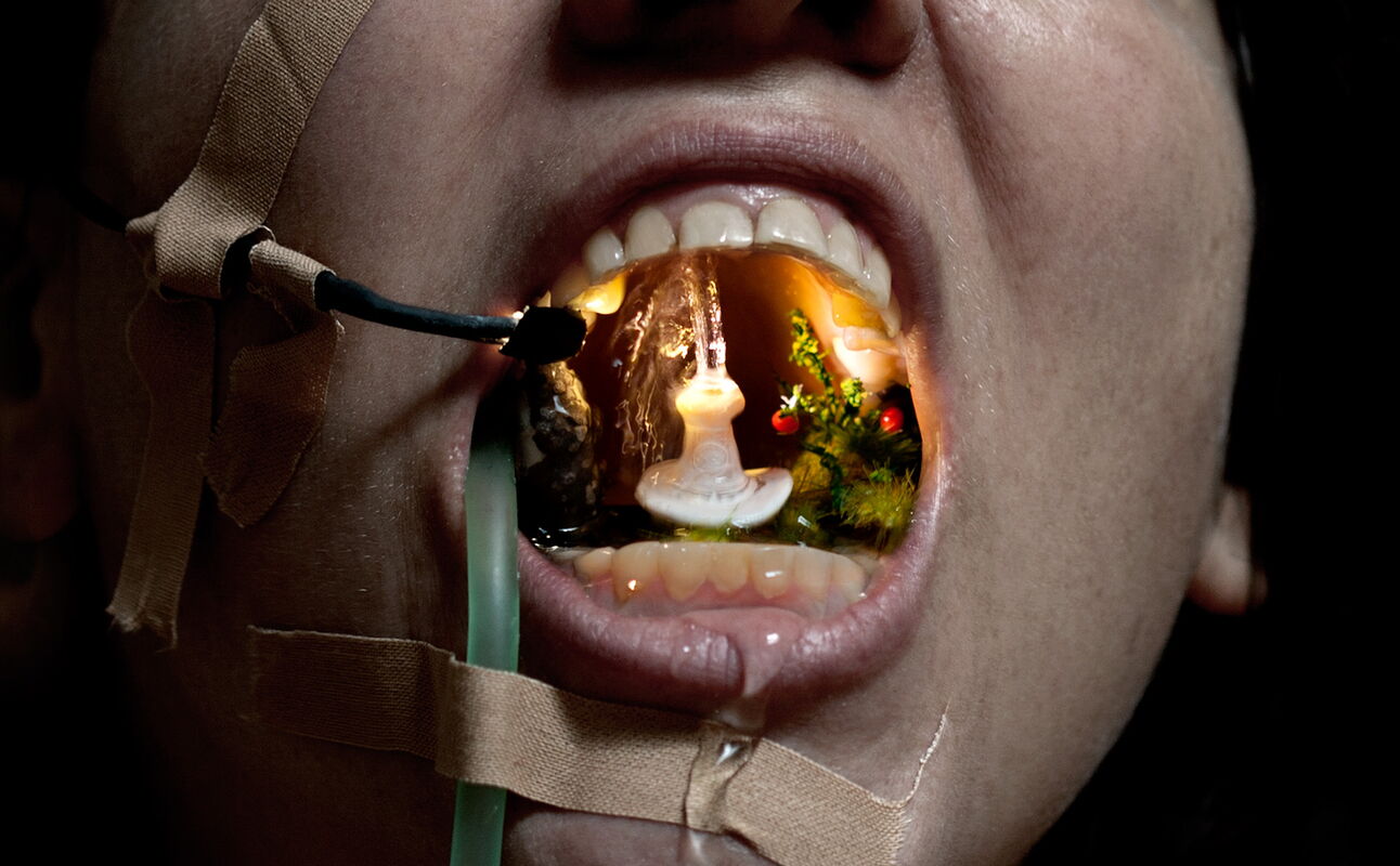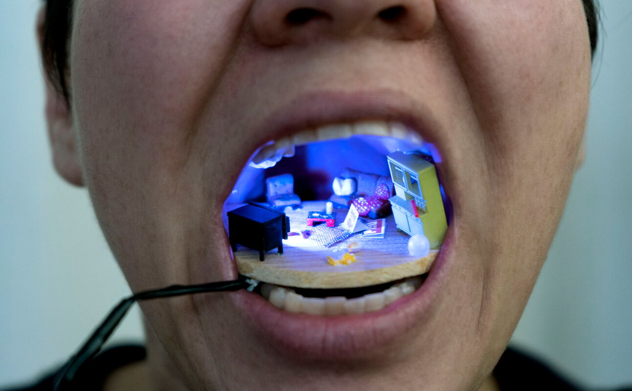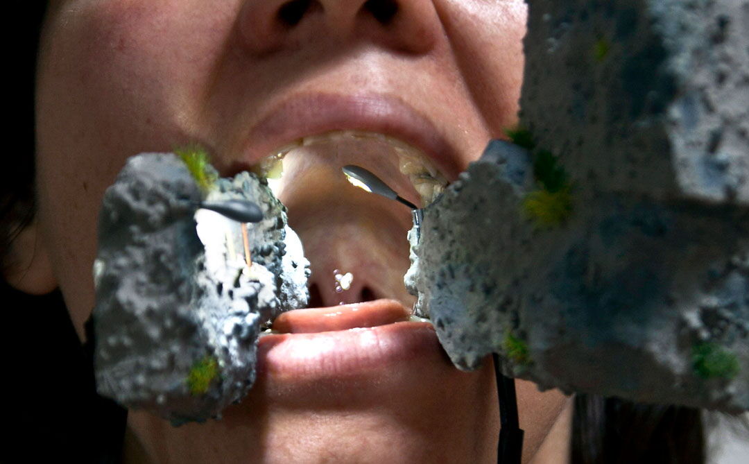 Die damit einhergehenden „Lücken“ oder Schwebezustände beschränken sich jedoch nicht auf die Zeit nach dem Tod, sondern sind ein essentieller Bestandteil des Lebens selbst. In ihrer eigenen Mundhöhle – einem sensiblen Ort zwischen Innen und Außen, an dem nicht nur Atem und Klang aus dem Körper dringen, sondern auch Kommunikation entsteht – stellt Judith Egger dreidimensionale „Miniaturräume“ aus. Der geöffnete Mund wird zur Bühne, zum Schaukasten, der verschiedene Szenerien offenbart. Diese werden live vom Klangkünstler und Komponisten Michael Northam (USA) begleitet und von der Kamerafrau Maria Rilz (D) auf eine Großleinwand übertragen. Dabei werden Laute aus dem Mundinnenraum der Künstlerin in den Sound integriert. Obgleich die in der Mundhöhle platzierten Miniaturarchitekturen verlassen sind und auf den ersten Blick eher statisch wirken, deuten beispielsweise das Flackern eines Fernsehers im Wohnzimmer oder das Sushi-Förderband im Restaurant auf Bewegung hin. So wie sich auch die schäumende Gischt in einer Felsenhöhle dem Stillstand verweigert, scheint das sprudelnde Wasser eines Springbrunnens den Kreislauf des Lebens nachzuahmen. Die Künstlerin kreiert mittels unterschiedlicher Szenerien Momente der Kontemplation und Stille, die jedoch gleichzeitig Umbruch und Veränderung antizipieren.