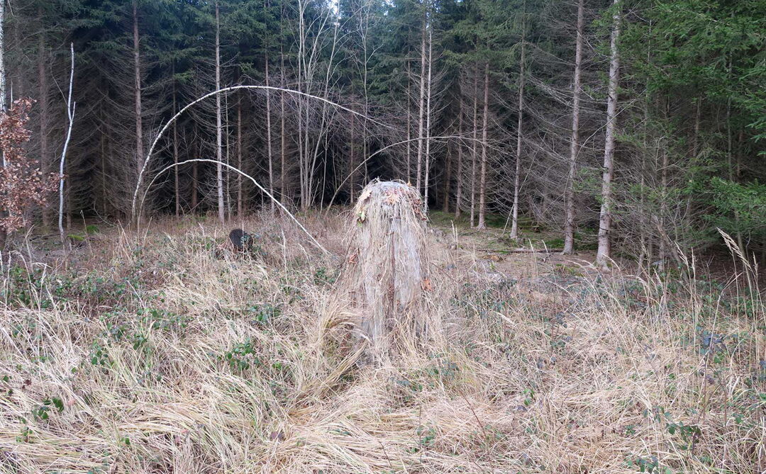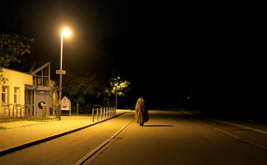„Verloren wirkt dieser kleine Strohhaufen, wie er da versucht über die Straße zu kommen. Zögernd setzt er einen Fuß über die Bordsteinkante, um ihn sofort wieder zurückzuziehen. Es ist dunkel, es regnet, und der Fluß der Autos ist gnadenlos. Keine Chance ür das selstame Wesen auf zwei Beinen das da im Feierabendverkehr irrlichtert, als hätte ein sadistischer Gott es dort ausgesetzt. Man weiß nicht recht, ob man die zerzauste Kreatur niedlich oder unheimlich finden soll (...). Mal stapft das Geschöpf zwischen den Pfeilern einer Straßenbrücke, mal treibt es sich bei den Stämmen eines Holzlagers herum oder durchquert bei dichte, Schneetreiben einen Wald. Wie ein Tier, das auf der Hut ist, beobachtet von einem Jäger? Oder einem Naturfilmer? Von uns? Das Auge einer sehr stillen Kamera jedenfalls wahrt stets wohlwollende Distanz. „Es ist dieses unerforschte Wesen, dem ich versuche, nahezukommen, und das mir immer wieder entwischt“, sagt Judith Egger über ihre aktuelle Ausstellung „Lauschen und Lauern“. Seit Jahren betreibt die Münchner Künstlerin Feld- und Tiefseelenforschung, um auf etwas zu stoßen, das viele Namen hat: das Unkontrollierbare, Unkalkulierbare, Unbekannte, Unbeherrschte.