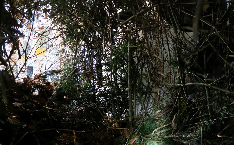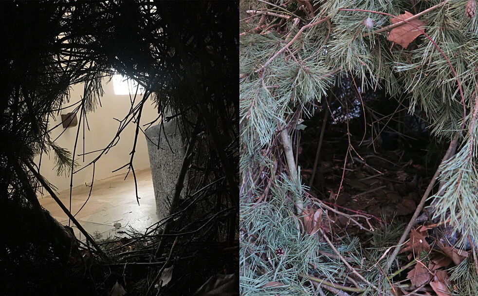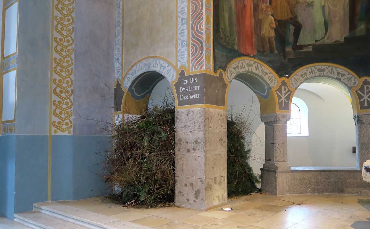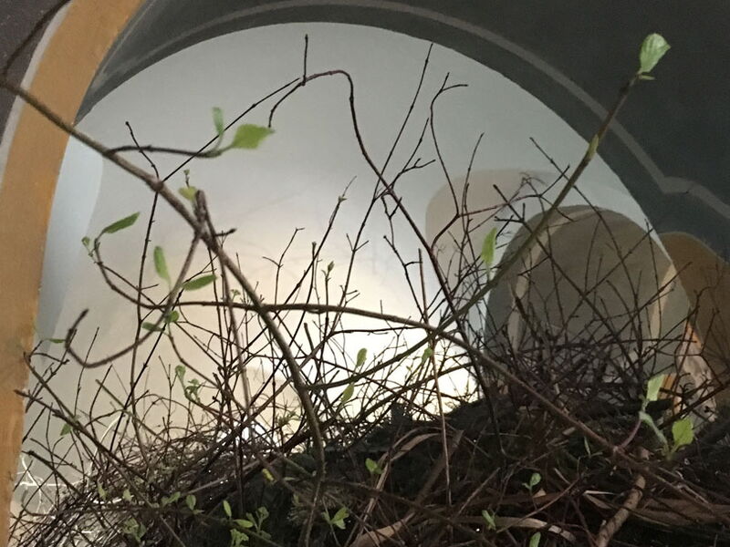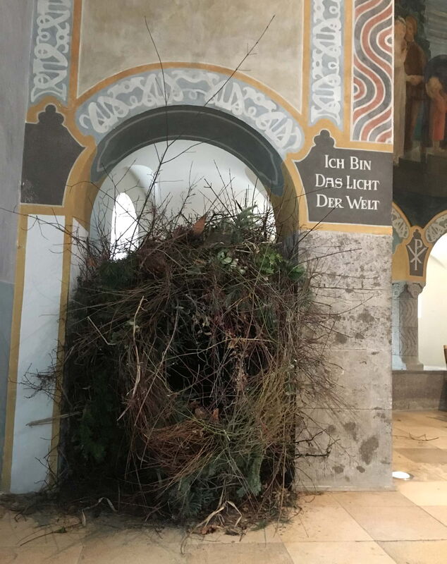 Ein aus Naturmaterialien erbauter Unterschlupf in der Apsis der Erlöserkirche in München. Die Installation findet im März und April statt. Unter anderem werden frisch geschnittene Zweige verwendet, die im Lauf der Tage - auf Ostern zu - Blätter treiben. Die Konstruktion ist wie ein von Kindern im Wald errichtetes Lager oder ein von einem Tier gebautes Nest. Sie wirkt fremd aber nicht unbedingt störend. Vielleicht erinnert sie an ein Schwalbennest, das von der friedlichen Koexistenz von Mensch und Natur zeugt. Vom Kirchenschiff aus kann man den Eingang in den