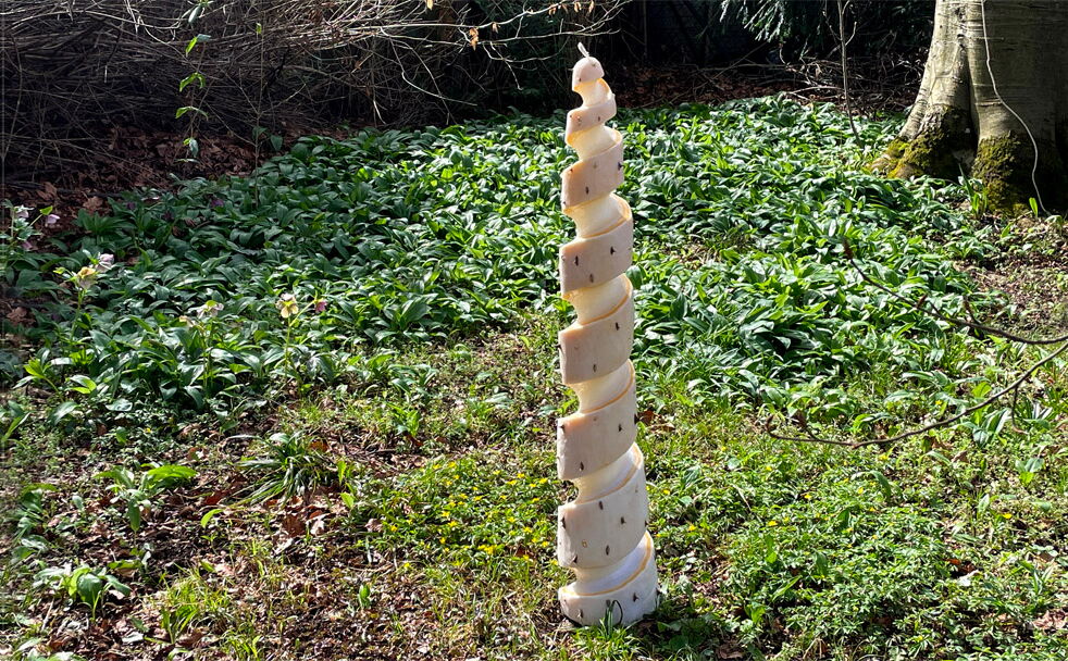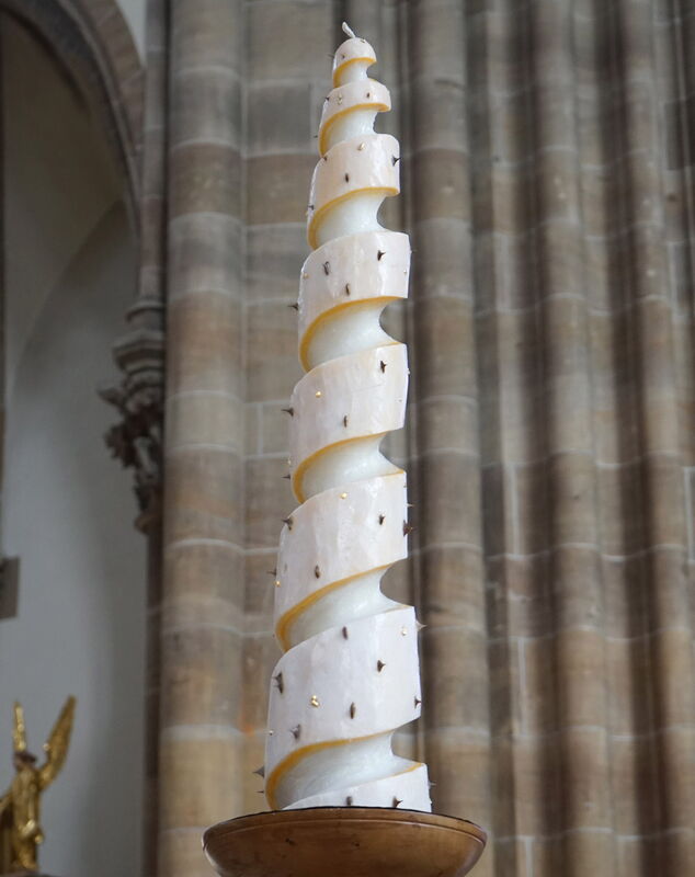 Die Osterkerze 2024 für St. Paul hat Judith Egger in Form einer sich nach oben hin verjüngenden Spirale gestaltet. Die Künstlerin, die aus einer Familie von Naturwissenschaftlern stammt, erforscht auf künstlerische Weise die Zusammenhänge des Lebens und erweitert so die Auseinandersetzung mit der Wirklichkeit in den Bereich des eigentlich nicht Sagbaren, des Wunderbaren hinein.