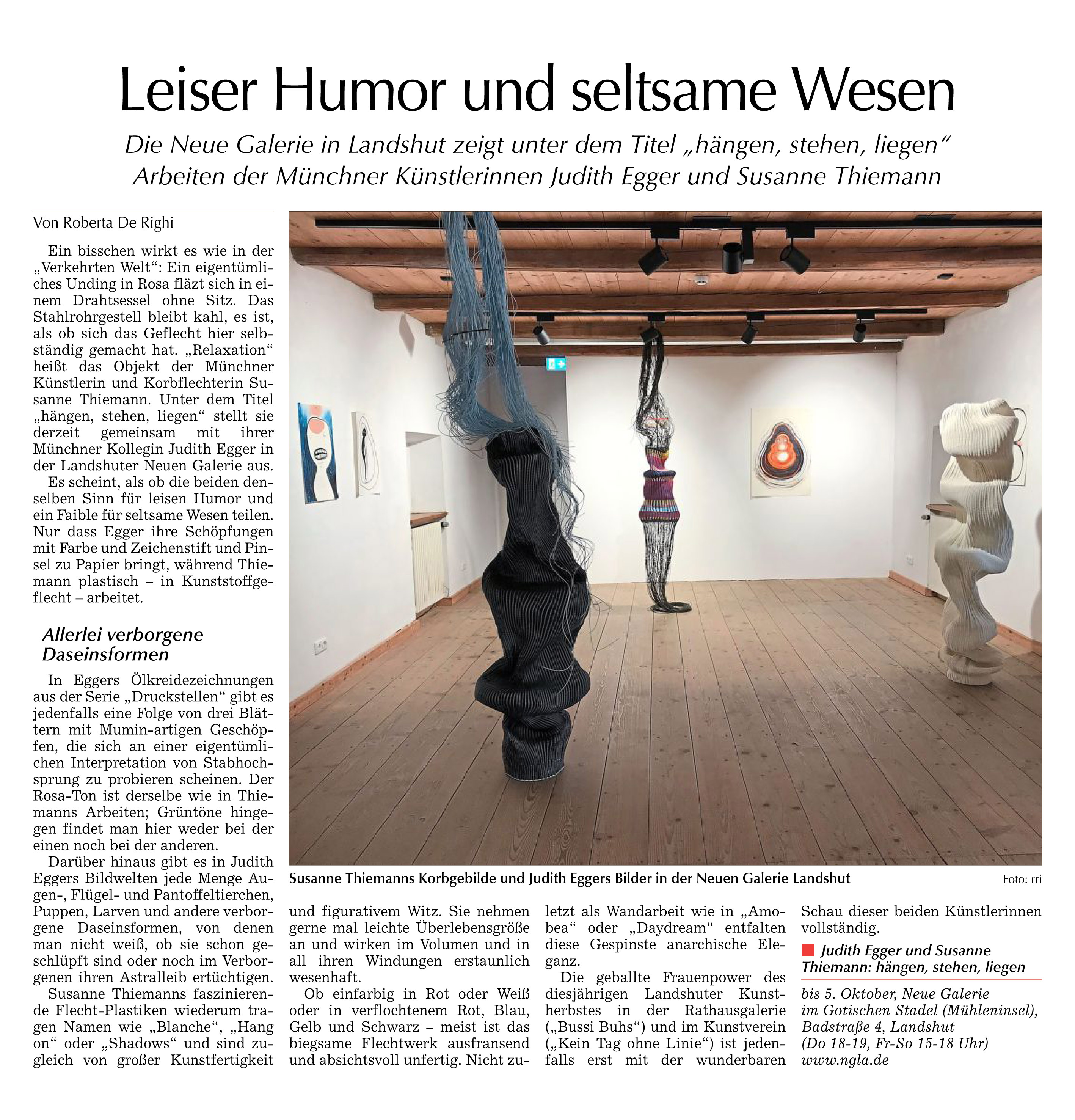 „Sichtbarkeit ist für mich ein politischer Akt: feministisch, vielschichtig, frei. Meine Arbeiten verweben Geschichte mit Zukunft – tastend, suchend, nie abgeschlossen.“ Diese Aussage von Susanne Thiemann lässt sich ebenso auf Judith Egger beziehen. Sie fasst zusammen, was diese Ausstellung im Kern trägt: eine feinsinnige Korrespondenz zwischen Eggers Zeichnungen und Thiemanns Flechtarbeiten. Kein im Vorfeld ausgeklügeltes Programm, sondern ein Einverständnis, das sich während des Entstehens im Gotischen Stadel unvermittelt offenbarte – aufleuchtend wie ein Aha-Moment.