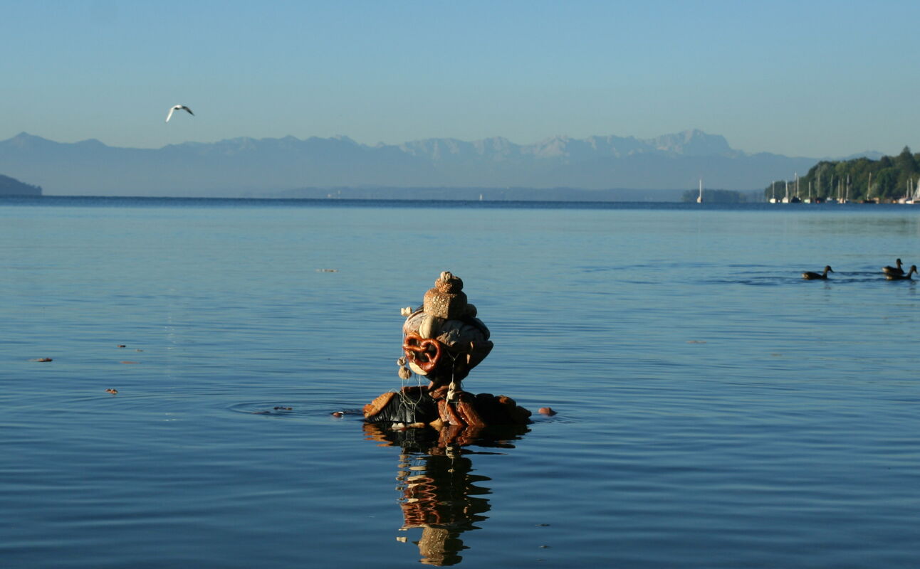 Judith Egger hat im Gespräch erzählt, daß sie mit den Wasservögeln ins Gespräch kommen wollte. Dafür hatte sie den Hut mit dem Brot aufgesetzt. Die Enten hat es nicht interessiert.