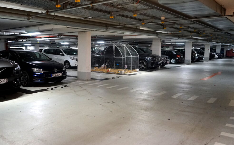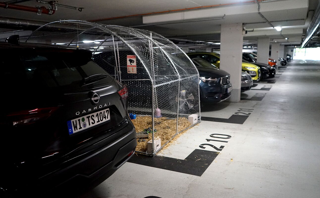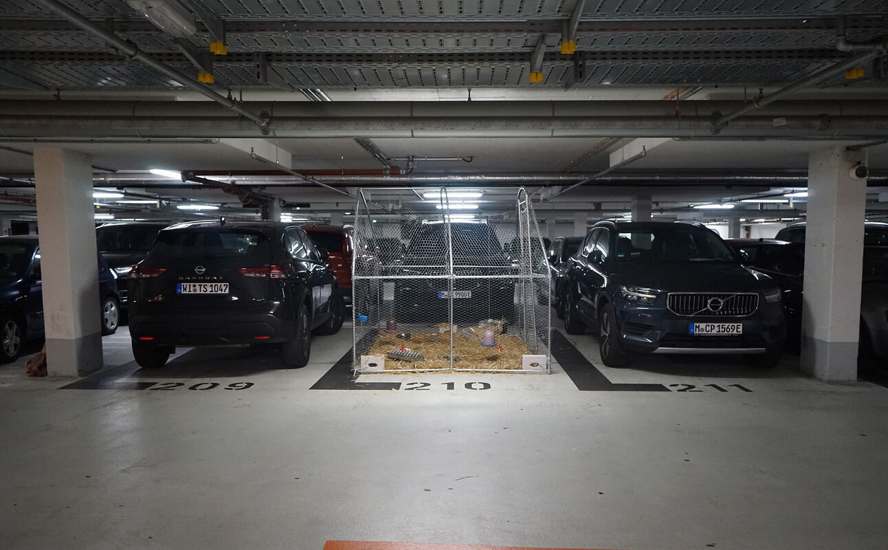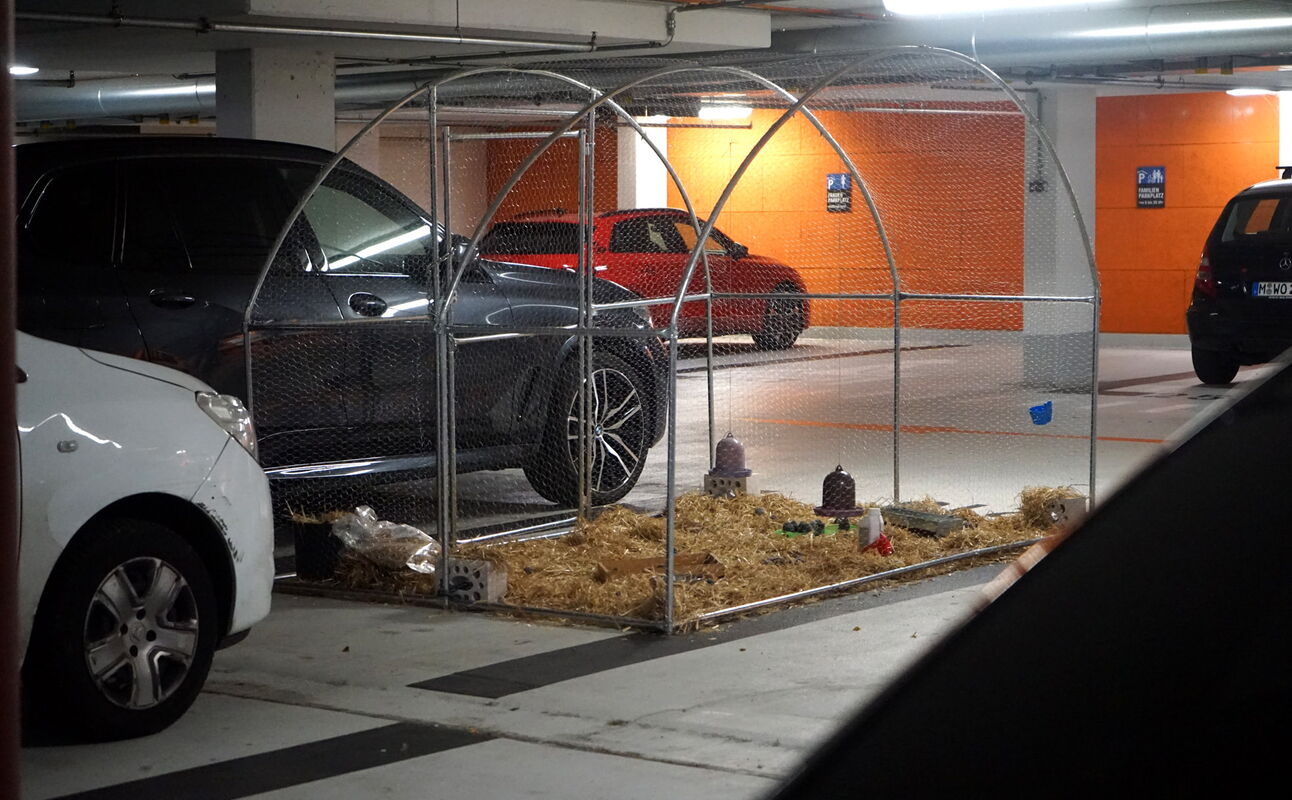 Der "Hühnerstall VIDAXL" steht auf einem Parkplatz zwischen den parkenden Autos, mitten in der Tiefgarage unterhalb des Knödelplatzes. Er befindet sich direkt auf dem Asphalt, inmitten von Abgasen und permanentem Neonlicht. Stroh, Futter- und Wassertröge deuten auf die Versorgung von Lebewesen hin. Der Stall ist zwar unbewohnt, dennoch zeugen eine größere Anzahl von Eiern davon, daß hier einmal gebrütet wurde. Die Eier sind schwarz, teilweise deformiert und aus manchen stehen Glassplitter heraus.