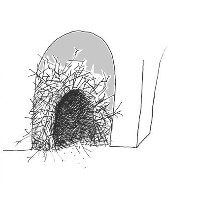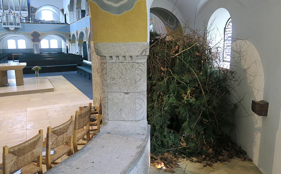 Ein aus Naturmaterialien erbauter Unterschlupf in der Apsis der Erlöserkirche in München. Die Installation findet im März und April statt. Unter anderem werden frisch geschnittene Zweige verwendet, die im Lauf der Tage - auf Ostern zu - Blätter treiben. Die Konstruktion ist wie ein von Kindern im Wald errichtetes Lager oder ein von einem Tier gebautes Nest. Sie wirkt fremd aber nicht unbedingt störend. Vielleicht erinnert sie an ein Schwalbennest, das von der friedlichen Koexistenz von Mensch und Natur zeugt. Vom Kirchenschiff aus kann man den Eingang in den