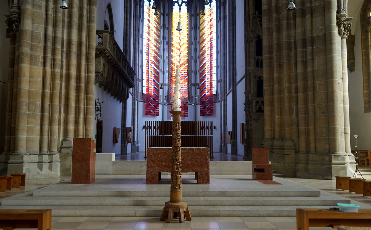 Die Osterkerze 2024 für St. Paul hat Judith Egger in Form einer sich nach oben hin verjüngenden Spirale gestaltet. Die Künstlerin, die aus einer Familie von Naturwissenschaftlern stammt, erforscht auf künstlerische Weise die Zusammenhänge des Lebens und erweitert so die Auseinandersetzung mit der Wirklichkeit in den Bereich des eigentlich nicht Sagbaren, des Wunderbaren hinein.