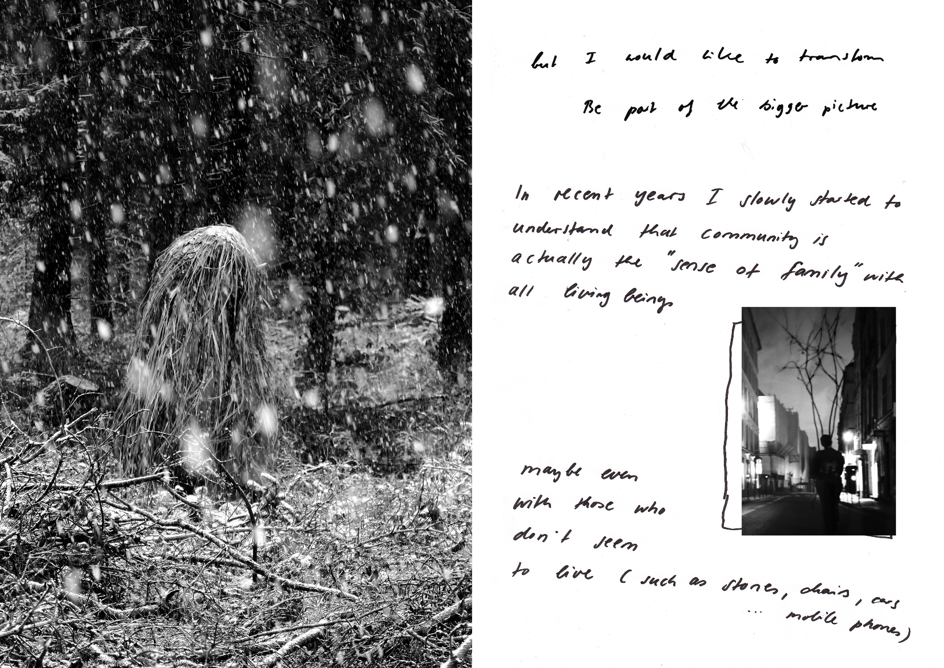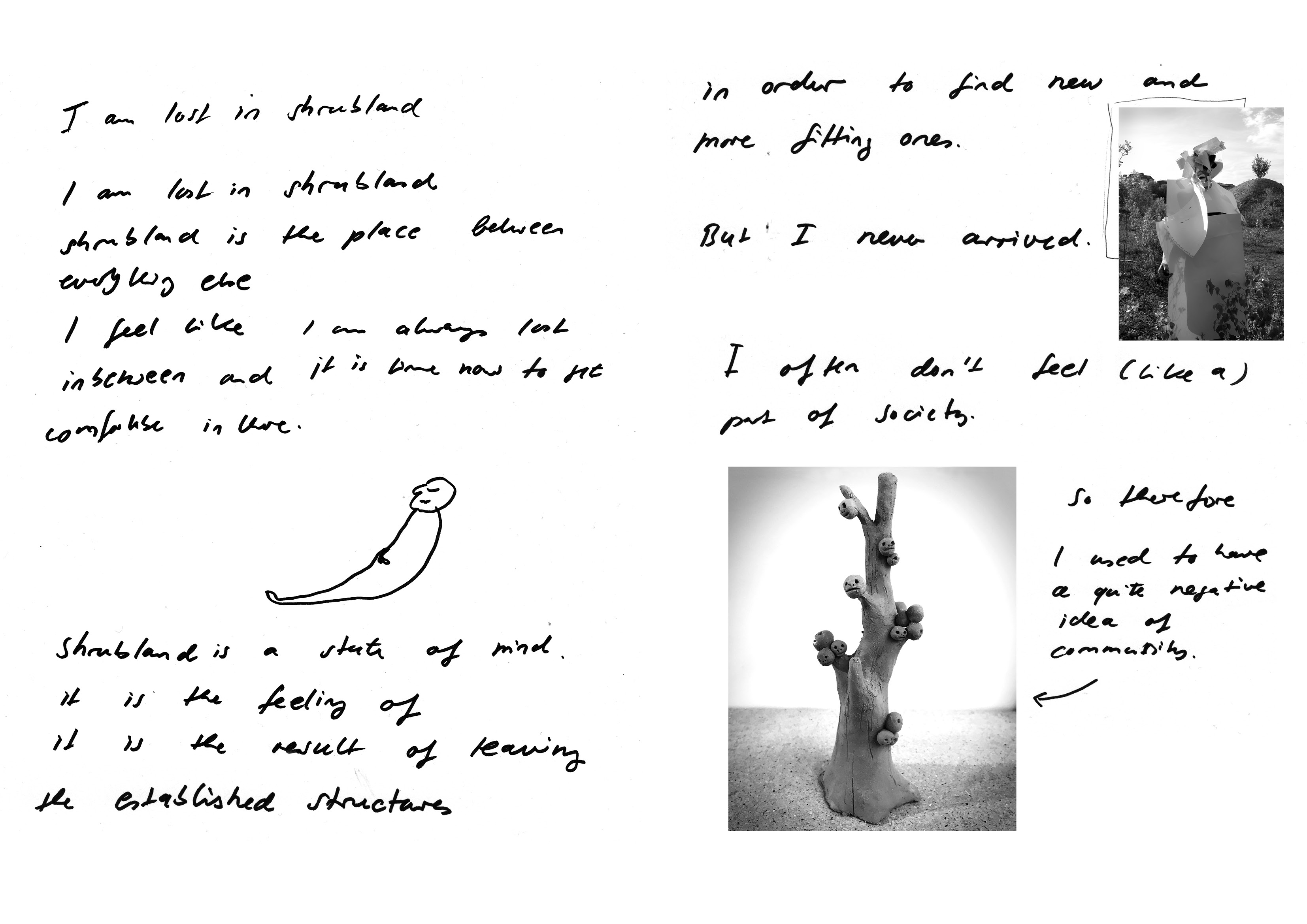 Meine Kunst ist sehr körperlich - daher kann ich viele meiner Ideen auch am besten performativ ausdrücken. Körperhüllen aus Gras, Prothesen aus Ästen oder ein Gestell mit Windhosen machen es mir möglich, mit der Welt auf neue Art in Kontakt zu treten.
