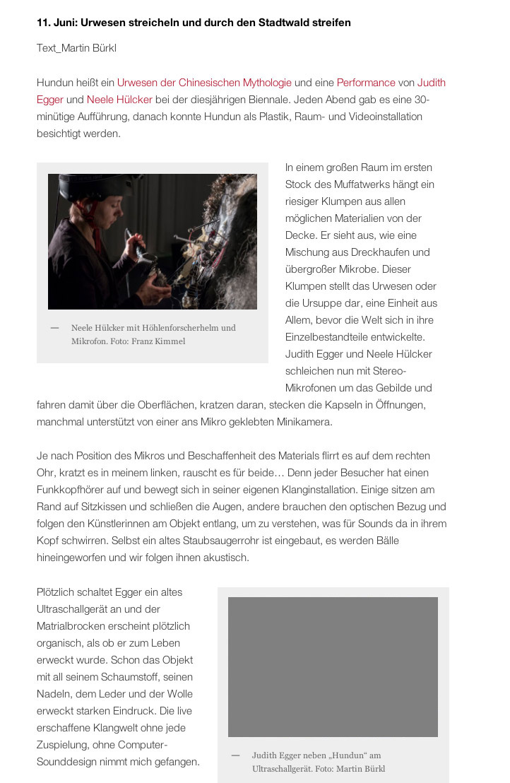 Während der halbstündigen Performance ist es im Saal dunkel, nur Hundun ist beleuchtet. Neele Hülcker und Judith Egger umrunden ihre Kreation. Wie Höhlenforscherinnen sehen sie aus: Auf dem Kopf ein Helm, daran befestigt eine Stirnlampe, aber auch eine Videokamera und Mikrophone. Ihre Körper sind von oben bis unten verkabelt. Die Kamera nimmt von extrem nahe die Oberfläche von Hundun auf und überträgt die Bilder auf Videobildschirme, die im Raum verteilt sind.