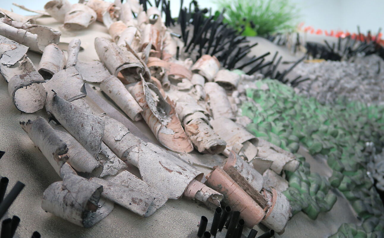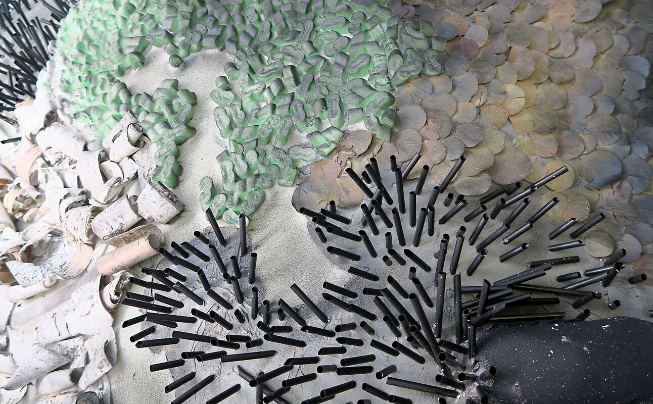 Hundun's surface was equipped by Judith Egger with many materials that reflect composer Neele Hülcker's artistic exploration of Autonomous Sensory Meridian Response (ASMR). These include everyday objects as well as many natural materials: plastic ice cream spoons, egg slicers, seed capsules, brushes, artificial hair, leaves, plants, a mud hole, and much more.