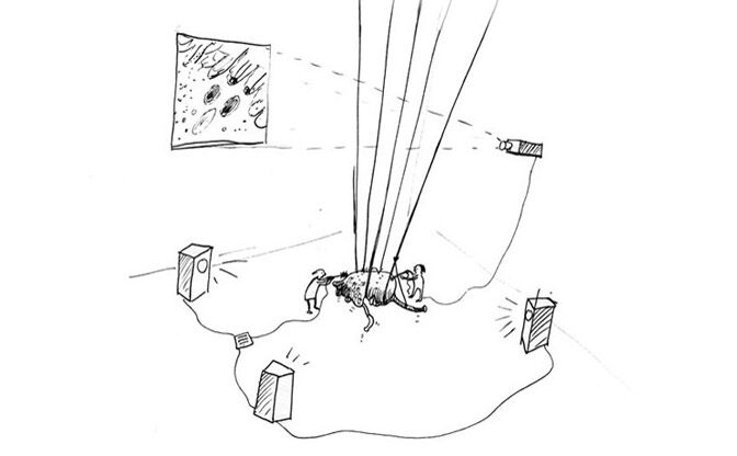 Wie unterm Mikroskop vergrössert sieht man Hunduns Haut: Sie besteht aus Strohhalmen, Bürstenborsten, Verpackungschips aus Styropor, Plastiklöffeln und vielem mehr – Verbrauchsgegenstände aus unserem Alltag, die mit Geigenbogen, Fingern, Holzstäben und anderen Utensilien zum Klingen gebracht werden. Diese Töne wiederum werden mit den Mikrofonen aufgenommen. Das Publikum spaziert um das Megaviech herum und hört die Hundun-Klänge über Kopfhörer – ganz nahe, im eigenen Kopf. Eine intime Begegnung mit Hundun.