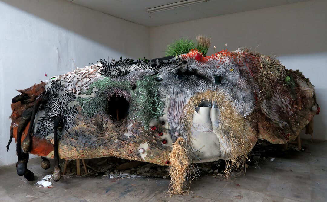 This installation is a synesthetic experience: shapeless, imposing, studded with a wide variety of materials from everyday culture and mystical prehistory.